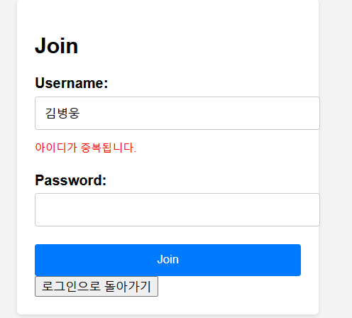 만약 아이디가 중복되면 글로벌 오류로 등록하여 다시 join 페이지로 돌아가 오류를 표시하였다.