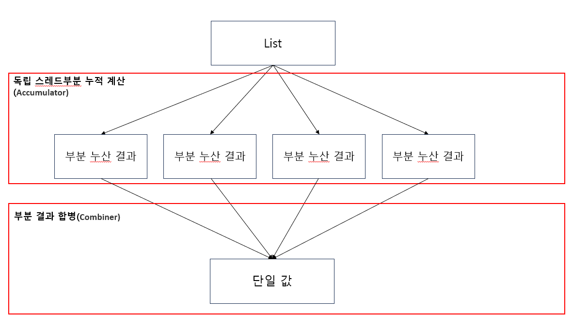 // 초기값 0을 사용하여 리스트의 모든 요소를 더함 (병렬 스트림에서는 combiner가 사용됨)