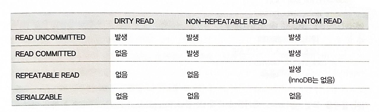 뒤로 갈 수록 격리 수준은 높아지지만 동시성 효율 또한 떨어집니다.