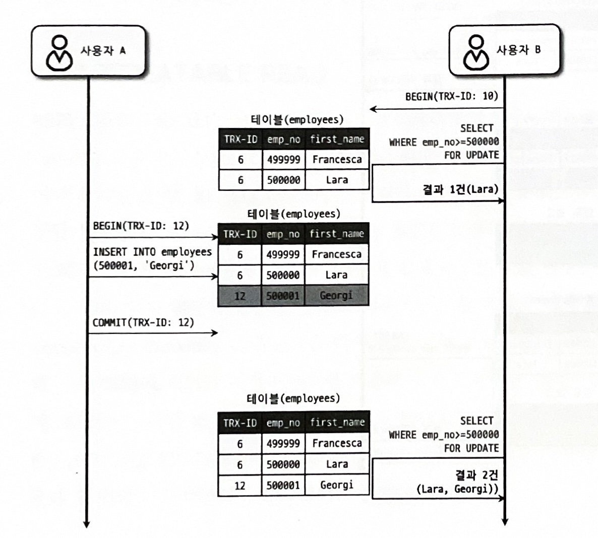 InnoDB에서 팬텀 리드가 발생하지 않는 이유는 첫 번째 SELECT ... FOR UPDATE 시에 갭락을 걸어 emp_no >= 500000 범위 내의 레코드 추가를 막기 때문입니다.
