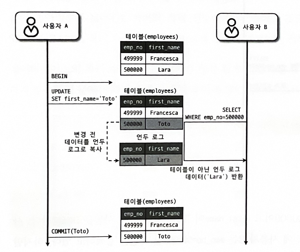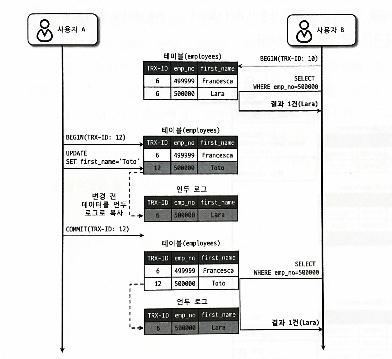 위 사진처럼 업데이트문을 실행해도 커밋되지 않는 한 언두 로그의 데이터를 이용해서 반영되지 않은 데이터를 읽습니다.