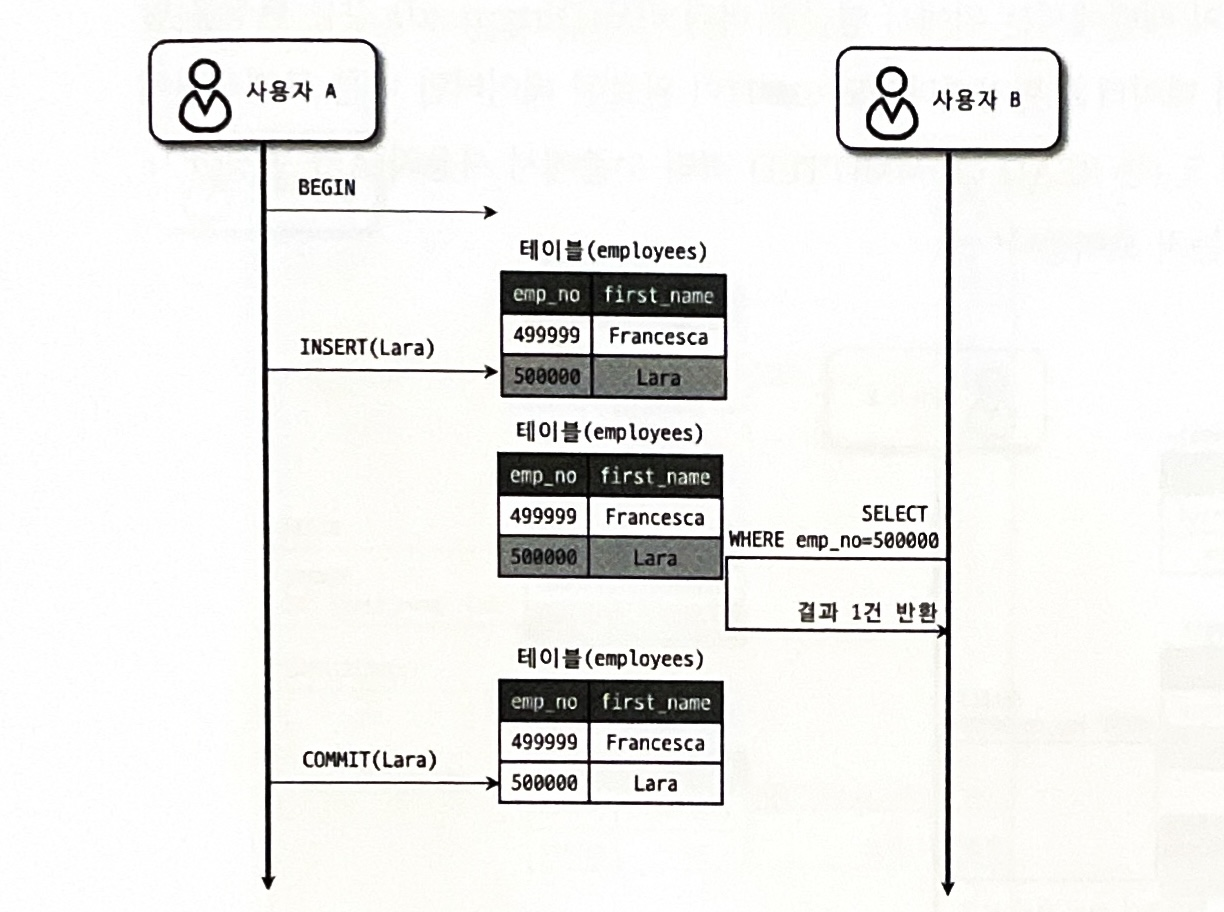 원래라면 INSERT로 갱신되는 레코드는 사용자 B의 조회 정보에 들어오지 못하는게 맞습니다.