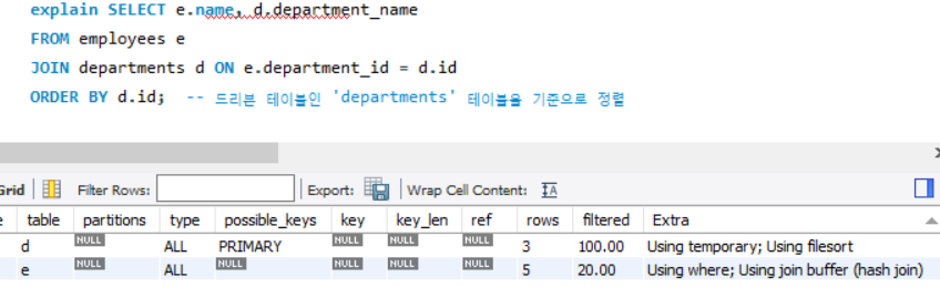 - 조인 처리: 조인 후 결과를 임시 테이블로 저장하고 정렬하는 경우 Using temporary; Using filesort 메시지가 표시됩니다.