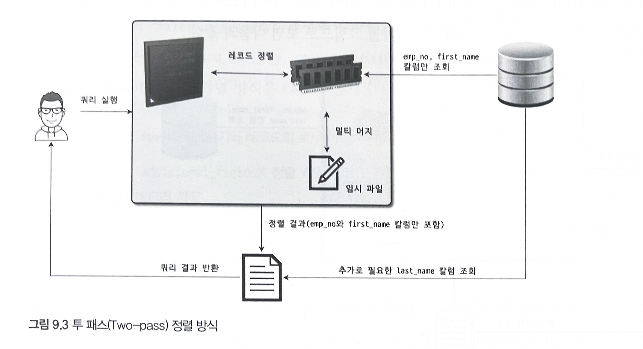 - 투 패스: 먼저 정렬 기준 칼럼을 정렬하고, 프라이머리 키로 다시 테이블을 읽어 필요한 칼럼을 가져오는 방식입니다.