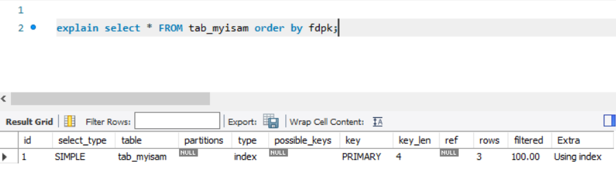 어떤것으로 정렬을 했는지는 실행 계획의 Extra 열로 확인이 가능하다 해당 사진은 id를 통해 조회했기에 클러스터링 인덱스를 사용하여 정렬한 것을 알 수 있다.