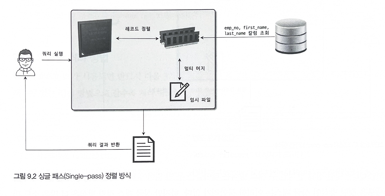 - 싱글 패스: 모든 정렬 기준을 소트 버퍼에 담아 한 번에 정렬하는 방식입니다.