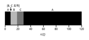 위 그림을 보면, A가 실행중이다가 B, C가 도착하고 나서 A를 중단한 후 가장 잔여시간이 짧은 작업인 B부터 C까지 순차적으로 처리한 뒤 다시 A를 재개하는 방식을 사용하고 있다.