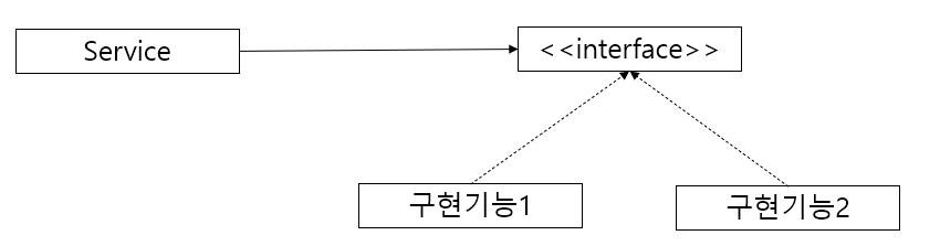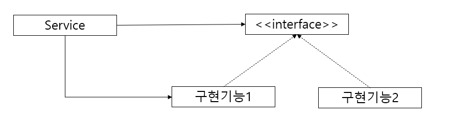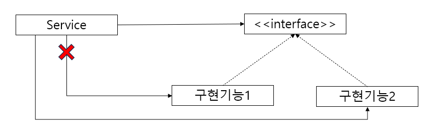 잘보면 클라이언트인 Service가 인터페이스 뿐만 아니라 구현 클레스도 함께 의존한다.
