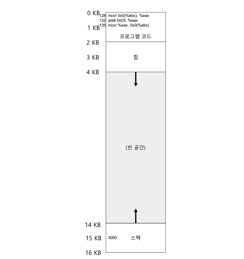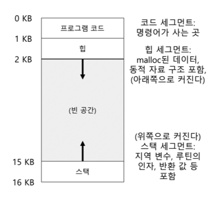 프로그램 관점에서 주소 공간은 주소 0부터 시작해서 최대 16KB까지이다. 프로그램이 생성한 모든 메모리 참조는 이 범위 내에 있다.