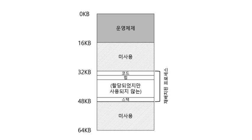 - 프로세스가 생성될 때 운영체제는 주소 공간이 저장될 메모리 공간을 찾아 조치를 취해야 한다.(빈 공간 리스트 자료 구조 검색)