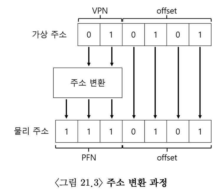 VPN을 사용해서 해당 페이지의 물리 주소를 찾아 낼 수 있다. Offset은 가상 페이지와 물리 주소상에서 동일하기 때문에 변환하지 않는다.