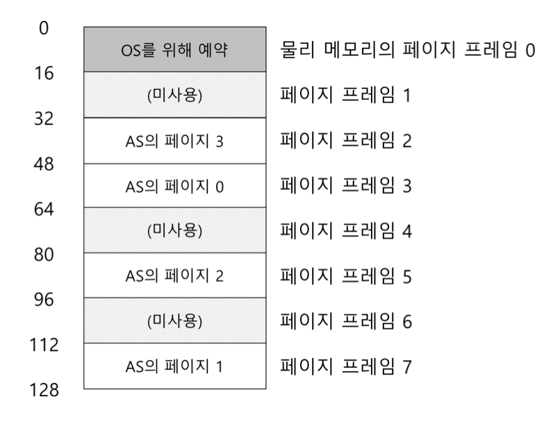 이 경우 8개의 페이지 프레임, 총 128바이트의 비현실적으로 작은 물리 메모리이다.