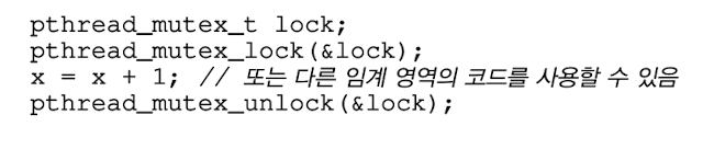 Pthread 라이브러리에서는 mutex를 사용하여 쓰레드 간 상호 배제를 지원합니다. pthread_mutex_lock()을 통해 락을 얻고, 락이 걸려 있으면 다른 쓰레드는 대기합니다.
