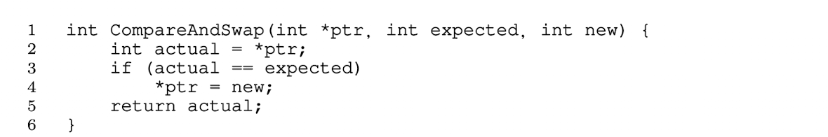 - Compare-And-Swap은 메모리 값을 비교하고 일치할 경우 값을 변경하는 명령어입니다. 이 기법은 Test-And-Set과 유사하게 락을 구현하는 데 사용될 수 있습니다.