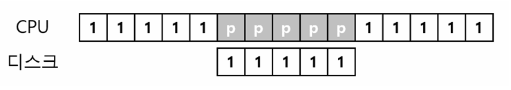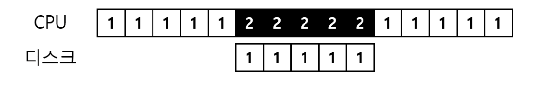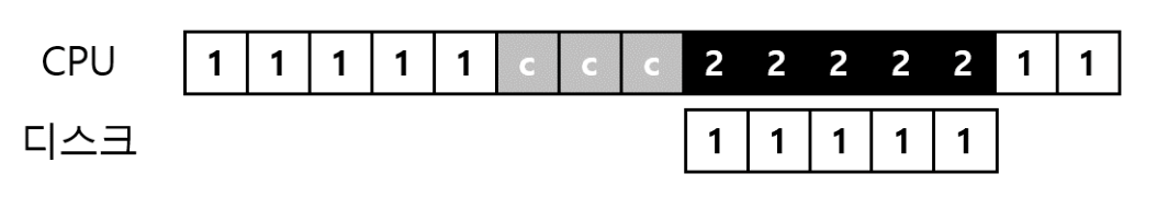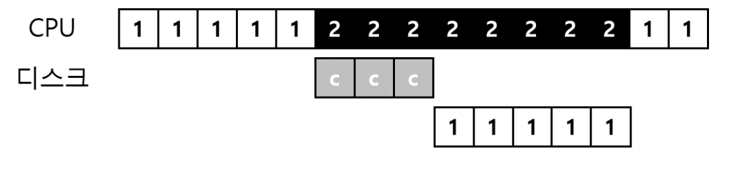 위 그림은 프로세스 1의 요청이 디스크에서 처리되는 동안에 운영체제는 프로세스 2가 CPU를 점유한다.