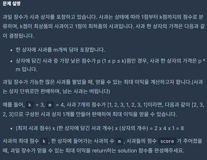 배열을 큰 수부터 정렬한 후 -> M개를 담는다 -> 해당 상자의 값은 가장 싼 사과에 m을 곱하는 것이다.