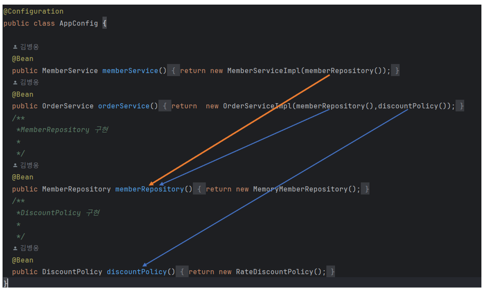 - AppConfig.class를 구성요소로 보냈기 때문에 @Bean 애노테이션이 있는 것으로 저장소를 구성한다.