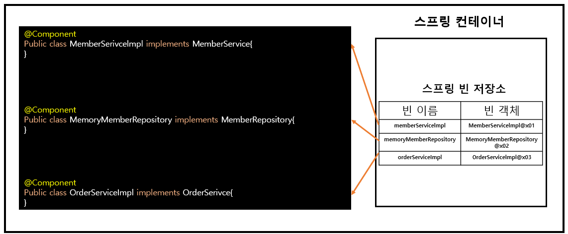 - 스프링은 자동 빈 등록인 @ComponentScan을 지원한다. 또한 @Autowired를 통해 의존 관계도 주입하게 된다.