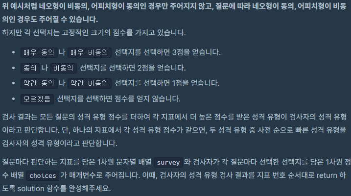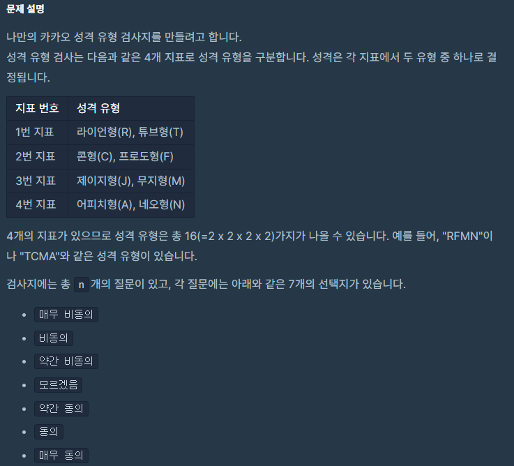 성격 유형에 맞춰 키 값으로 해결한 다음 삼항 연산자를 이용해서 정렬하여 정답을 출력하였다.