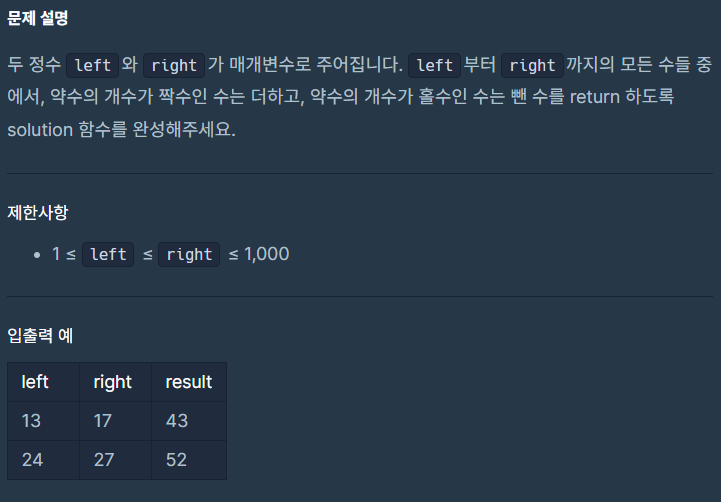 [Programmers]LV.1 약수의 개수와 덧셈 본문