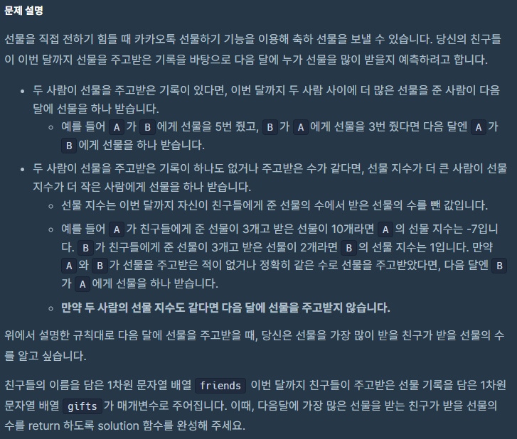 [Programmers]Lv.1 가장 많이 받은 선물 본문