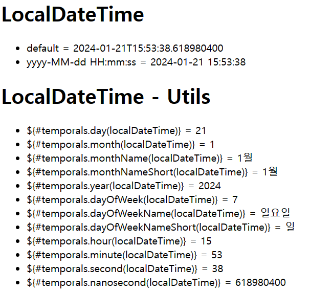<li>${#temporals.dayOfWeek(localDateTime)} = <span th:text="${#temporals.dayOfWeek(localDateTime)}"></span></li>
