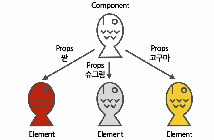 여기서 등장하는 것이 Props이다. Props에 따라 팥붕어빵인지 슈크림 붕어빵인지를 결정한다.
