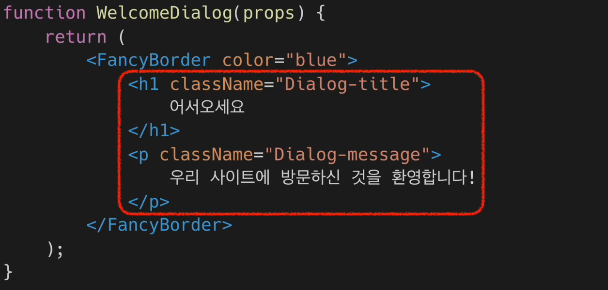FancyBorder 컴포넌트 안에 있는 모든 JSX 태그는 children으로 전달된다.