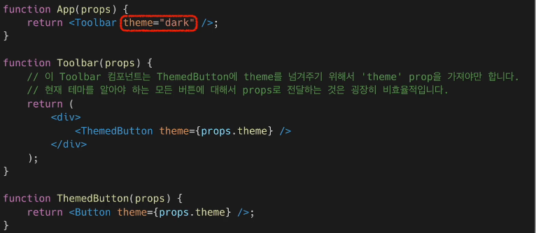 이처럼 테마 하나를 위해 깊이가 깊은 코드를 내려가야 한다. 이것을 해결하는 것이 Context이다.